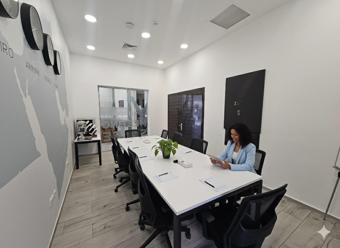 تم تصميم هذه الغرفة الحديثة لتعزيز روح التعاون والإنتاجية. تحتوي على طاولة اجتماعات أنيقة مع مقاعد مريحة تتسع لعدة أشخاص، مما يجعلها مثالية لاجتماعات الفرق أو لقاءات العملاء. يضفي التصميم البسيط وديكور خريطة العالم والفواصل الزجاجية أجواءً مهنية وجذابة، كما توفر زاوية الضيافة راحة إضافية للمشاركين.