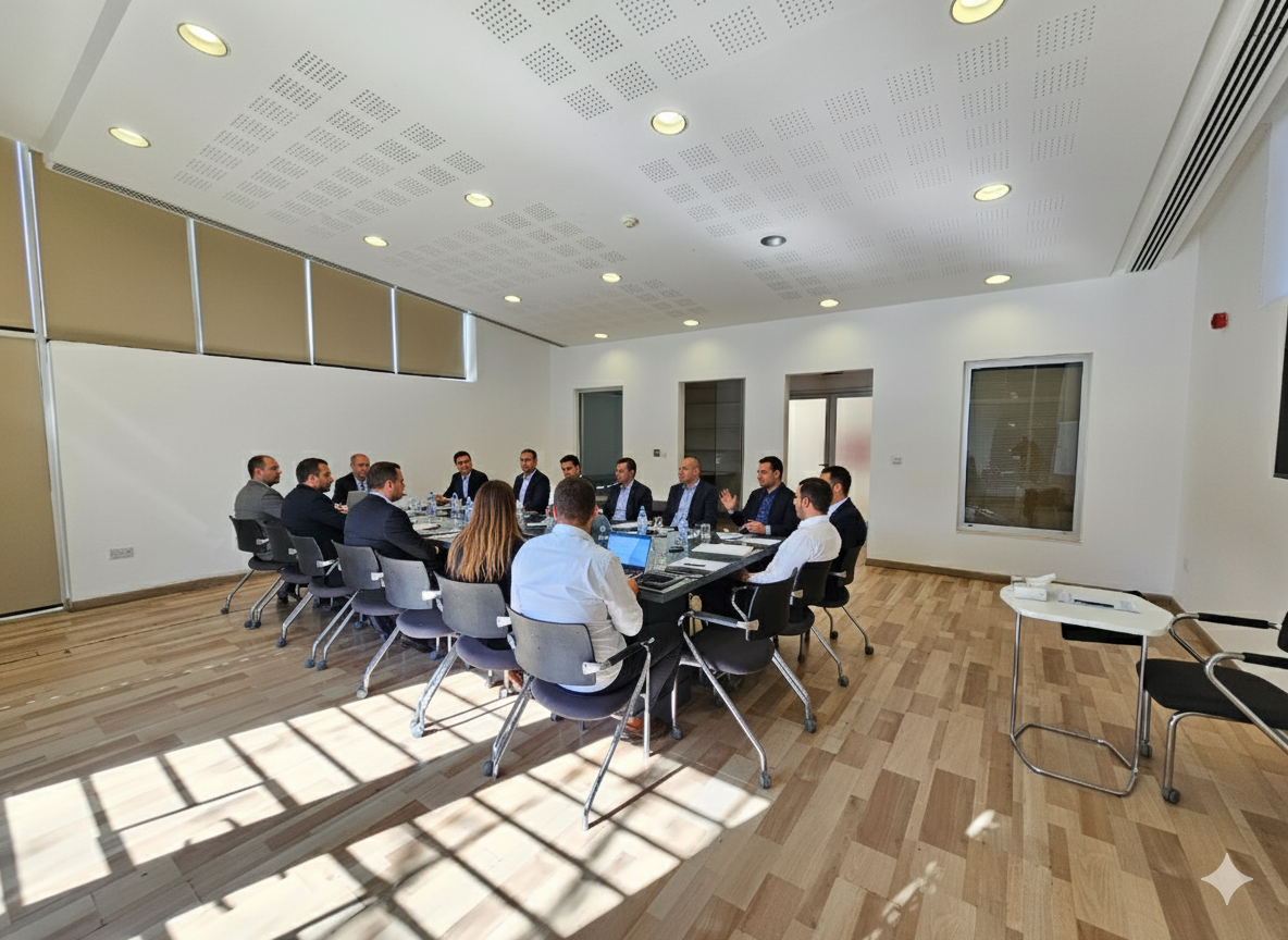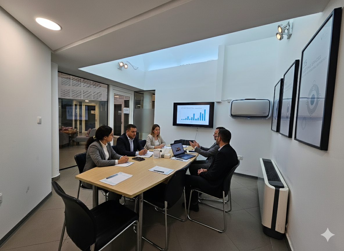 A sleek and professional meeting room designed for focused discussions and seamless presentations. The room features a central meeting table with comfortable seating, ideal for team meetings, client briefings, or strategic planning sessions. A wall-mounted screen provides easy connectivity for prese...