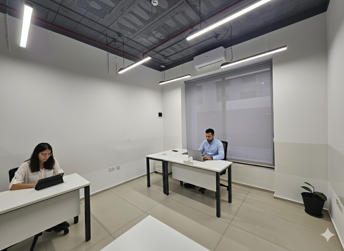 Inside, the building blends luxury and functionality. A spacious atrium with marble flooring and panoramic glass elevators welcomes visitors into a bright, professional atmosphere. The interior features fully furnished offices, collaborative meeting rooms, and flexible coworking areas—all designed to enhance productivity and comfort. With high-speed internet, advanced climate control, and dedicated on-site support, every detail is built to meet modern business needs.