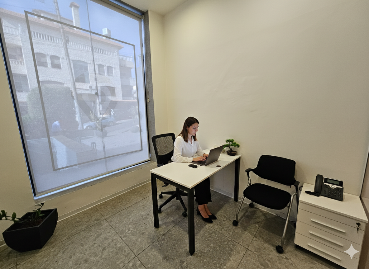 This compact private office offers a professional and quiet space ideal for individual work or one-on-one meetings. A large window brings in natural light while maintaining privacy with a screen shade. The room includes a simple desk setup, guest chair, and storage, all in a clean and minimalist des...
