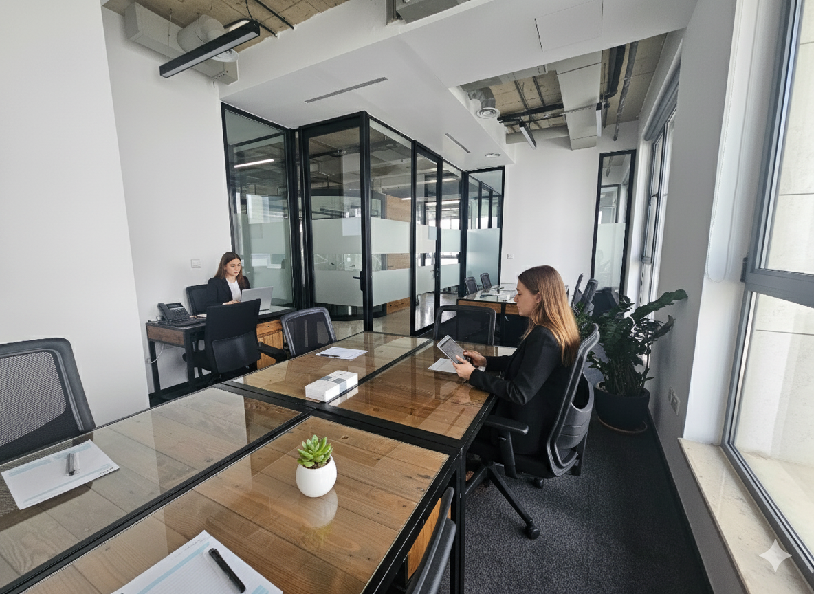 This modern private office is designed for focused, productive work in a sleek and professional environment. Featuring ergonomic chairs, individual desks, and floor-to-ceiling glass walls with frosted sections for privacy, the space balances openness with discretion. Contemporary lighting and minima...