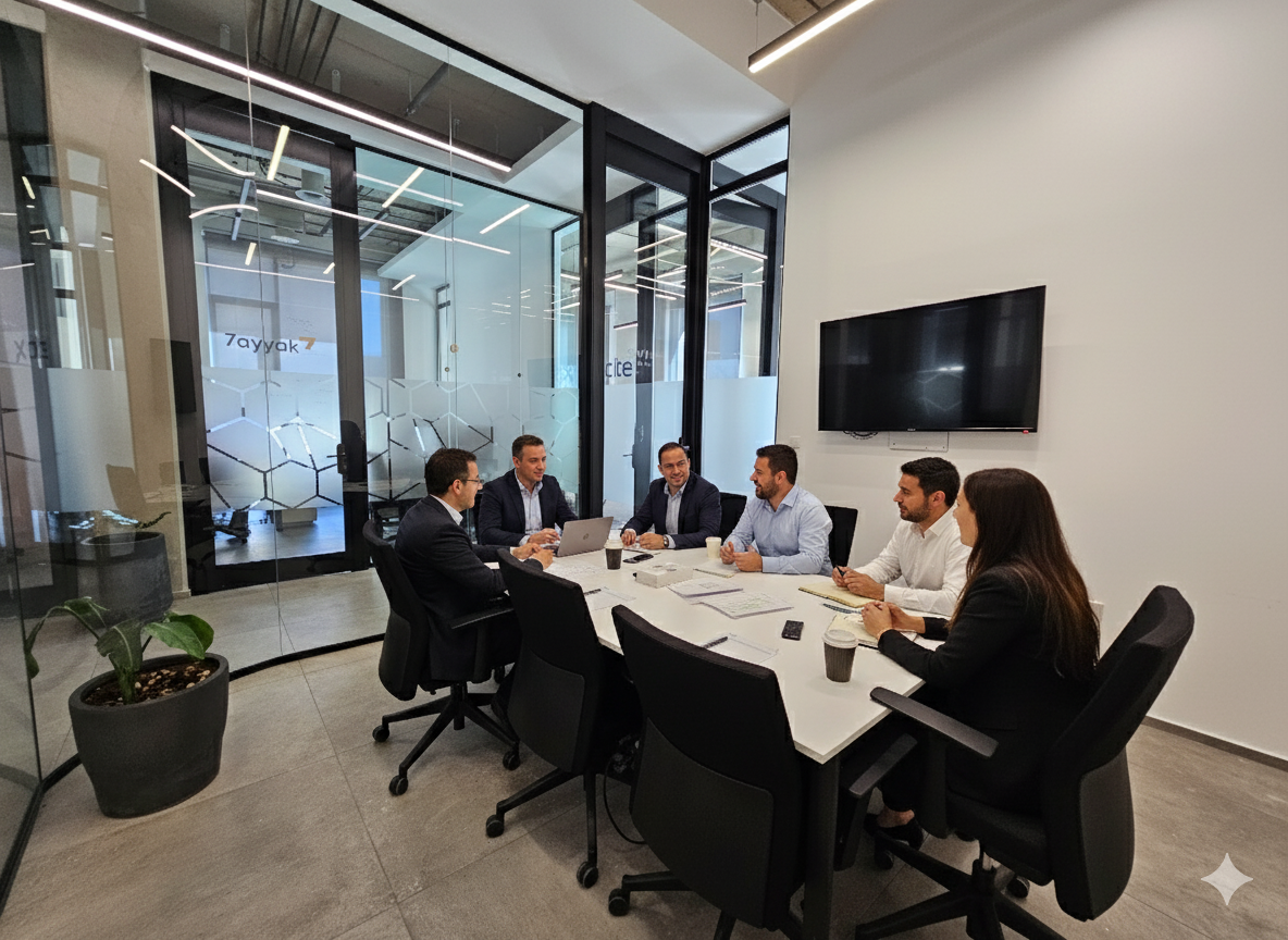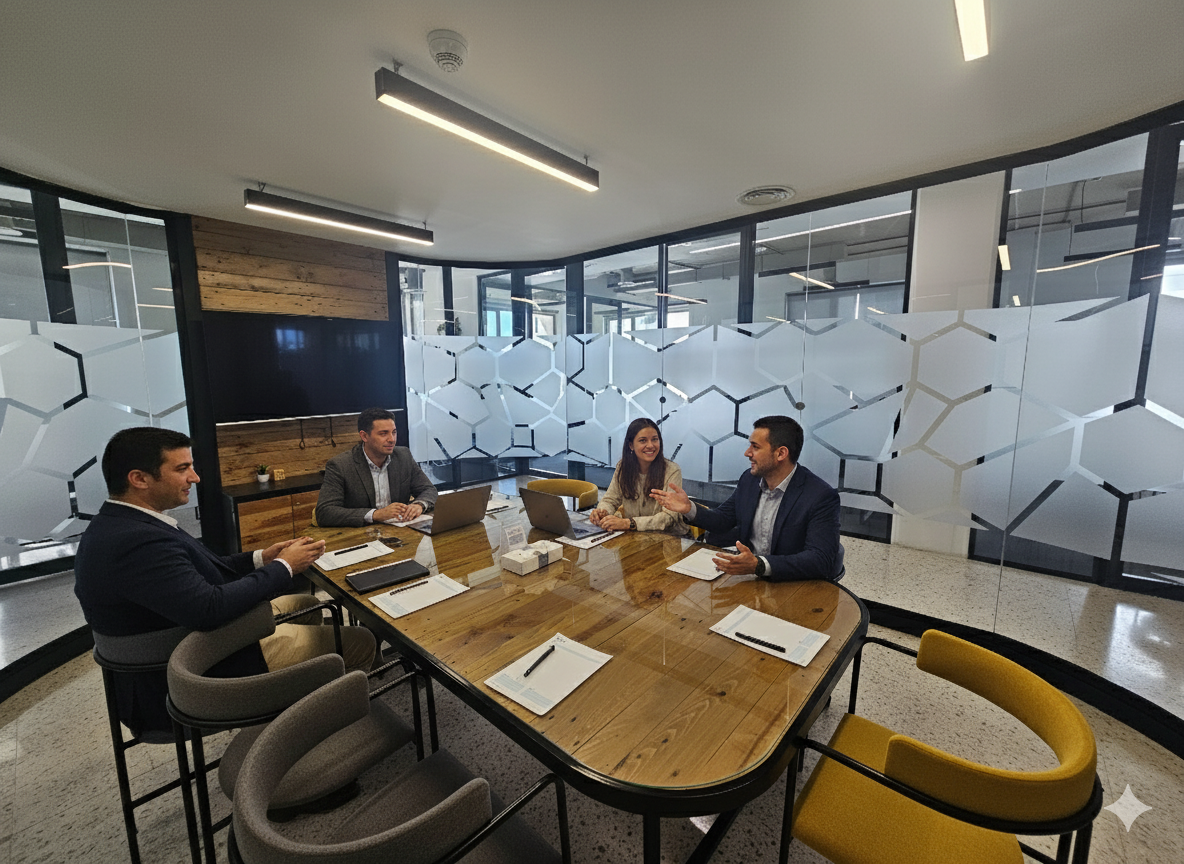 A contemporary meeting room designed for collaboration and productivity. The space features a large wooden table surrounded by comfortable modern chairs, ideal for team discussions and client meetings. Frosted glass walls offer privacy while maintaining a bright and open atmosphere. Equipped with a...