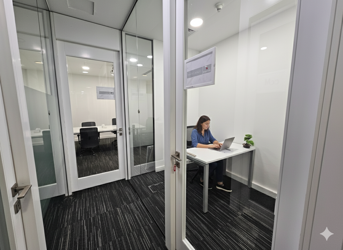 This workspace features modern, glass-partitioned private offices and meeting rooms designed for both privacy and visibility. Each room is furnished with contemporary desks and chairs, sound-insulated walls, and a professional layout ideal for focused tasks or collaborative meetings. The minimalist...
